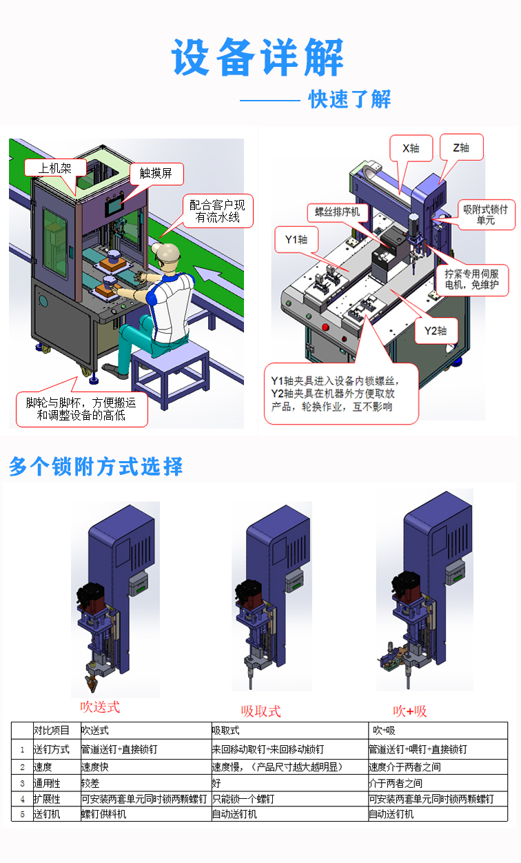 桌面型自動鎖螺絲機,主打是小規模半自動生產線。具有小型輕巧,可雙Y軸同步交替作業,提升生產效率;螺絲通用性好,通過更換螺絲送釘機或螺絲盒可實現通用M1.0~M4的螺絲,適合